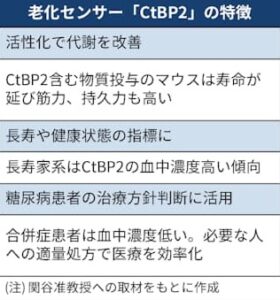 いわゆる長寿家系では、CtBP2の血中濃度が高い傾向にありました。一方、糖尿病患者のうち、心臓や腎臓で合併症が起きている患者は、CtBP2の血中濃度が低値でした。個人差はありますが、CtBP2が長寿や健康状態の指標に使えるとしています。