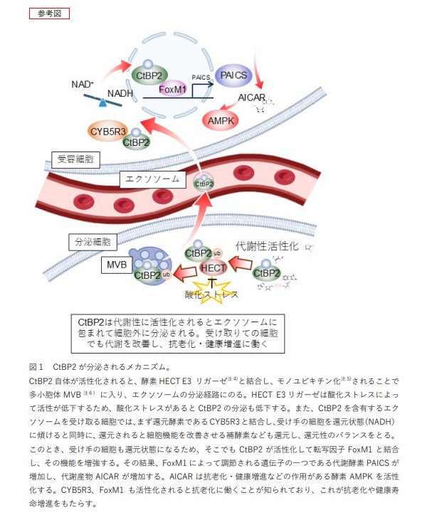 研究チームは、CtBP2が活性化するとエクソソームと呼ばれる微粒子に包まれて細胞外に分泌され、全身の代謝を改善する働きがあることを突き止めました。マウスによる実験で、CtBP2を含むエクソソームとそうでないものとを投与したところ、CtBP2を含むエクソソームを投与されたマウスの寿命が延びたほか、筋力や持久力も高くなりました。