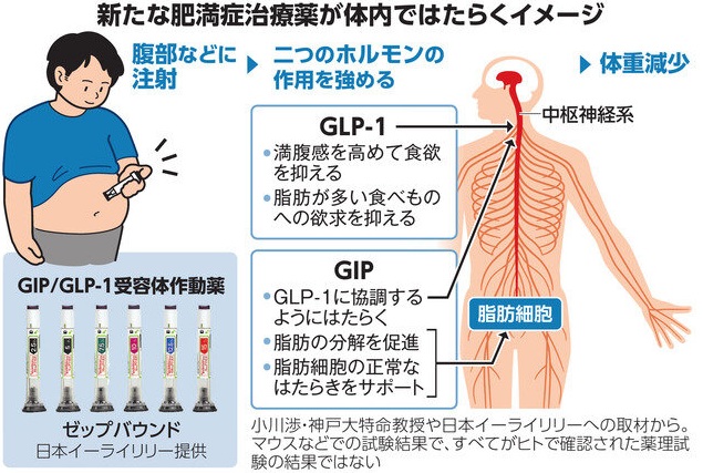 新薬の登場により、肥満症の治療が大変革期を迎えています。ゼップバウンドと呼ばれる薬は、体内にある二つのホルモンであるGLP-1とGIPの作用を強める効果があり、GIP/ GLP-1受容体作動薬と呼ばれています。GLP-1は、脳の中枢神経系に作用して食欲を抑え、胃の内容物の排出も抑えます。GIPは、GLP-1に協調するように働き、さらに効果を高めると考えられています。GIPは脂肪細胞にも作用して脂肪の分解を促進します。