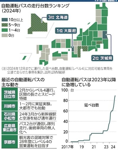 自動運転バスの活用が広がってきています。2024年12月までに延べ89台が運行し、2年間で5倍となっています。都道府県別の1位は大阪・関西万博を契機に導入が進んだ大阪府です。運転手不足を背景に路線バスの廃止が相次ぐ中、住民の足を支える手段として期待が大きくなっています。都道府県別では、大阪府の14台が最多で茨城県の10台と続いています。