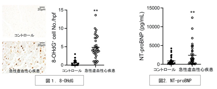 司法解剖した67人を対象に、心臓組織のDNAの損傷を示す指標である8―OHdGを調べるとともに、心臓への負荷を示す血中物質のNT―proBNPを解析しています。その結果、心臓が原因とみられる突然死では、心筋細胞の核内に8―OHdGの蓄積が多く認められ、NT―proBNPも高値を示す傾向が確認されました。