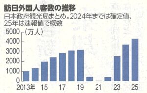 2025年に日本を訪れた外国人は、前年比16%増の4,270万人で、2024年の3,687万人を超えて過去最多となりました。4千万人を超えるのは初めてです。年間消費額も16%増の9.5兆円で過去最高になっています。