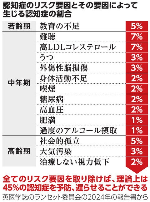 予防では、英医学誌ランセットの専門家委員会が昨夏に公表した報告書が注目されています。難聴や喫煙、社会的孤立など14項目のリスク要因を取り除くことで、または進行を遅らせる可能性があるとしています。