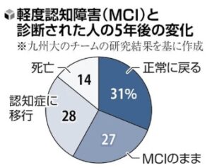 調査は、2012年と2017年に認知症の前段階である軽度認知障害(MCI)と診断された高齢者計398人を対象に実施され、正常に戻ったのは119人(31%)で、MCIのままだったのは102人(27%)、認知症に移行したのは106人(28%)でした。認知機能が回復した人の背景を解析すると、糖尿病がないことや、血圧が低い、年齢が若い、握力が強いなどの要因がありました。