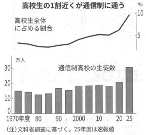 通信制高校の生徒は、2025年度に初めて30万人を超えました。全国の高校生の10人に1人が通っています。不登校を経験した学生の増加により受け皿としての役割が高まったほか、自分のペースで学べるためスポーツや芸能活動に注力したい生徒や海外大志望者なども増えています。