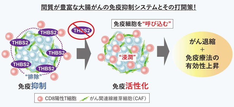京都大学の研究グループは、間質が豊富で治療が効きにくい大腸がんに多く存在するトロンボスポンジン-2(THBS2)というタンパク質が、がん細胞を攻撃する免疫細胞であるCD8陽性T細胞ががんの中に侵入を妨げ、がん免疫を抑制していることを発見しました。