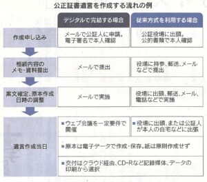 公正証書の作成申し込みは公証役場に出向かなくても、メールで申請できます。本人確認は運転免許証や印鑑証明書といった公的書類の代わりに電子署名などで実施します。遺言原本の作成ではウェブ会議を利用できて、遺言者本人と公証人、証人が参加し、公証人が案文を読み上げます。本人が内容を再確認し修正がなければ、公証人が案文をPDF化して画面共有をします。参加者それぞれが電子署名をすると遺言原本が完成します。