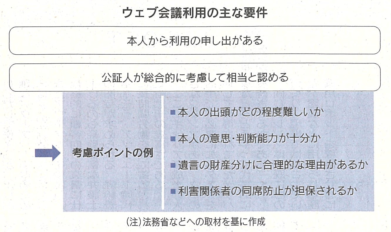 遺言を残す人は80歳代など高齢者が中心で、体力の低下や重い病気で外出が難しいケースは少なくありません。判断能力はあっても病院や自宅で終末期療養をしていたり、要介護状態で高齢者向け施設に入居していたりする人はウェブ会議を活用する意義があります。本人が高齢などを理由に出向けない時は公証人が本人の自宅や病院、施設などで対応することも可能です。日当として4時間以内の出張なら1万円、4時間超は2万円が発生します。本人が病気などで日常的にベッドで過ごしている場合は、証書作成料に50%が加算されます。