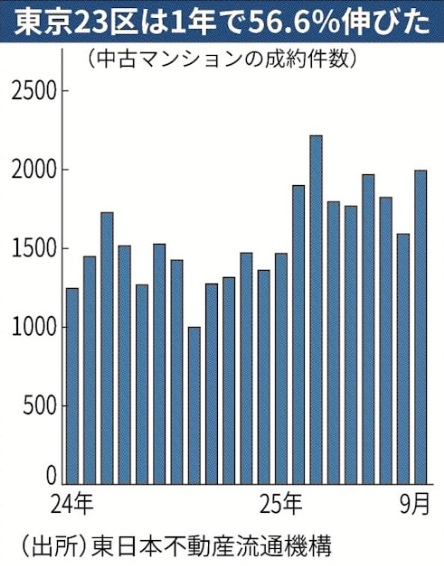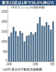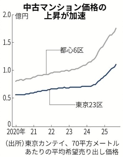 東京23区の中古マンションの価格上昇が加速しています。9月の平均希望売り出し価格は前月比2.9%高の70㎡あたり1億1,034万円と、初めて1億1,000万円を超えました。新築物件の供給が細るなかで中古市場に実需層が流れているほか、株高を背景に富裕層も中古物件への投資余力を高めています。