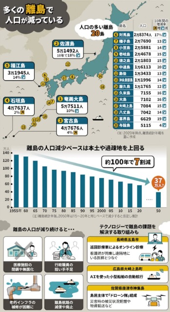 国内に300以上ある離島は、本土以上に急速な人口減と高齢化に見舞われています。日本離島センターによれば、1955年に約135万人だった離島人口は2020年時点で約57万人に減少しています。2015~2020年と同じペースで減れば、2050年は37万人と約100年間で7割減る計算になります。全国一律で提供されるべき医療や水道などライフラインを維持できなければ、さらに人口流出が進みます。
