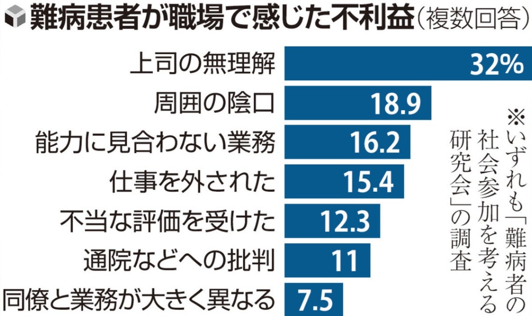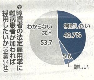 難病者の社会参加を考える研究会の調査によれば、働く患者228人の半数超が、職場に病状を伝えたことで不利益を感じたと答えています。上司の無理解や周囲の陰口が目立っています。既に難病患者を雇っているのは3分の1で、法定雇用率に算入された場合は、4割の企業が採用を検討する意向を示しています。自治体の間では、急な欠勤や通院で安定した就業が難しいといった否定的な意見も根強く、小規模自治体では余力がないという声も寄せられています。
