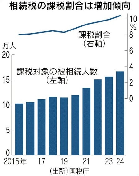 国税庁によれば、2024年に亡くなった160万5,378人のうち、相続税が課された割合は10.4%で初めて1割を超えました。不動産や金融資産の価値上昇が背景にあるとみられます。全体の相続財産額は24兆5,415億円でした。項目別では現金・預貯金が8兆5,602億円がトップで、有価証券は4兆3,676億円でした。