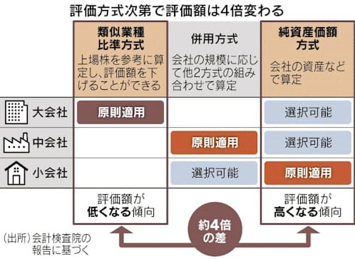 国税庁が非上場株の評価ルールを見直すとしています。相続時に時価を測るための物差しが、事業承継を促す政策目的で使われてきた実態が背景にあります。使う方式次第で評価額に4倍の差が出るケースもあり、かねて抜本改正の必要性が指摘されていました。非上場株は明確な時価が存在しないため、相続時の評価額は、財産評価基本通達に基づいて算定していました。