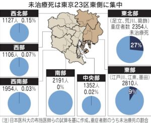 日本医科大医師らの研究チームによれば、首都直下地震発生時に適切な治療を受けられずに亡くなる未治療死は約900人でした。住宅の耐震化が進み、2022年の前回試算から8割強減少しています。ほぼ全てが東京23区東側に集中しており、住宅密集地で緊急車両が通行できる道路環境を整備するなどの対策が必要となります。
