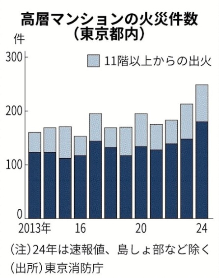 東京消防庁によれば、2024年に東京都内で起きた高層マンションの火災は249件で、このうち69件が11階以上の高層階からの出火でした。タワーマンションの増加などを背景に件数自体は増加傾向にあります。棟の中心部分の階段やエレベーターを通って熱気が上昇し、上階に延焼しやすい構造になっている高層住宅群で、短時間に高層階まで燃え広がります。階段やエレベーターに煙が入れば避難が難しくなります。