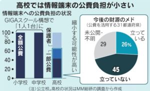 公費による1人1台端末が実現した小中学校では授業改善が進む一方で、高校では端末代が重荷になり、利用も低調となっています。MM総研の調査によれば、高校での情報端末の公費負担をする地域で、継続の見通しが立っているのは8自治体に過ぎません。コロナ下での臨時的な交付金を原資とした自治体が多いという事情があります。中高生の52%が端末を無料または安く買えたり、レンタルできるようにする支援を望んでいます。