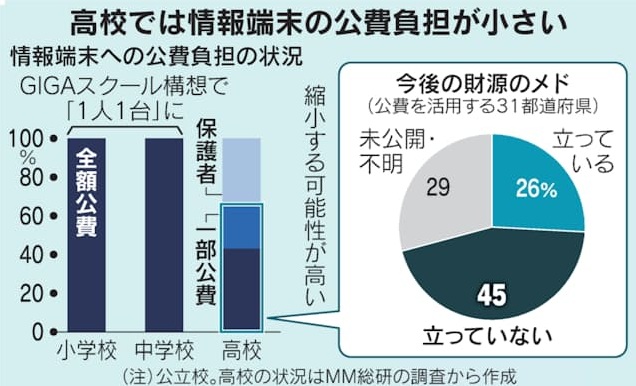 私立高では端末の購入支援は少なく、保護者には費用負担がのしかかっています。小中学校では端末を使って学ぶ風景が定着していますが、高校でICT機器を使う機会は少なくなっています。高校の現場では、教員の板書きをノートに写す伝統的な授業風景が少なくありません。受験を視野に入れた学習が優先し、端末を使った探求的な学びをする余裕は少なくなっています。