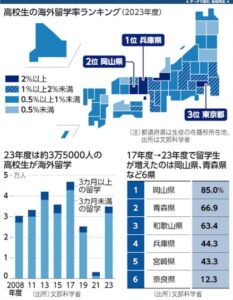 留学した高校生は2023年度で3万4,885人に達しています。ピークの7割強ですが、新型コロナウイルス禍で落ち込んだ2021年度の11倍超になっています。青森県は地域課題の解決策を学ぶ高校生を海外に送り出しています。愛媛県では留学経験者が起業して街おこしをしています。留学が地域の力になる人材を育んでいます。岡山県は85.0%増で伸び率が最も高く、青森県は66.9%増、和歌山県も63.4%増でした。