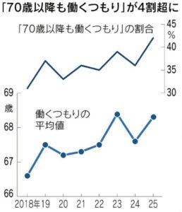 日本経済新聞社の世論調査によれば、70歳になっても働くと答えたのが42%で、2018年の調査開始から初めて4割を超えました。70~74歳が23%、75歳以上が19%でした。政府は高年齢者雇用安定法で、70歳までの就業機会の確保を企業の努力義務としています。