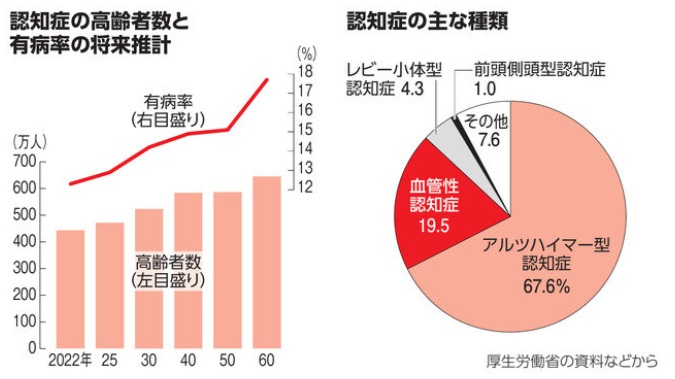 厚生労働省の推計によると、2025年時点で、65歳以上の高齢者のうち認知症の人は471万6千人(12.9%)に達しています。2040年には584万2千人(14.9%)に増えるとみられています。認知症の前段階である軽度認知障害(MCI)の人もあわせると、2022年時点で65歳以上のうち、3割弱の人が認知機能の低下がみられる状態にあるとされています。