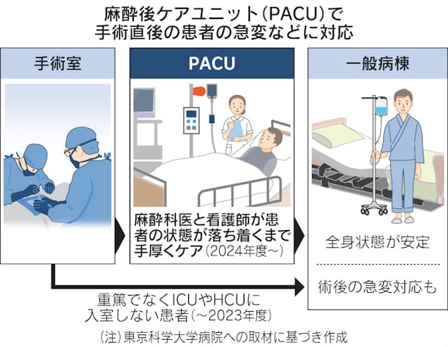 全身麻酔による手術直後に、麻酔科医や専門の看護師が患者の痛みや呼吸などの全身状態を観察し、必要に応じて介入する麻酔後ケアユニット(PACU)の本格的な取り組みが始まっています。患者の安全性と回復の質を高め、病院運営の効率化も期待されています。