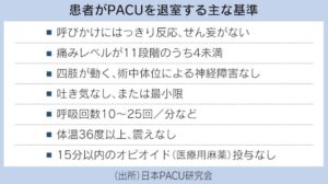 国は、2022年度から診療報酬に術後疼痛管理チーム加算を新設しましたが、手術翌日からの対応が対象です。手術直後から全身状態を監視するため、日本麻酔科学会などはPACU加算を新たに設けるよう提案しています。米国では、術後の患者を早期に退院させる際、PACUの麻酔科医が安全性を確認します。その上で手術担当医が退院の判断をしています。日本でも病床を効率的に活用するため、全身麻酔の手術後でも早期退院が必要になる可能性があります。