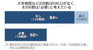 PACUは、米国や英国では医療指針に盛り込まれて定着しています。日本では簡易な麻酔後ケアをする回復室がありましたが、重篤でない患者への麻酔後ケアの視点が注目されにくいなどの背景から、回復室も減ってきました。大学病院など155施設のうち回復室を含むPACUがあったのは16%のみでした。手術の複雑化と効率化が進み、高齢でリスクが高い患者も増えており、PACUの必要性が高まっています。