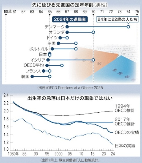 少子化の加速で、社会保障制度をどう維持するかが先進国共通の課題となってきています。高齢者比率が高まると年金、医療、介護などの現役世代の負担が増大します。解決策として、高齢者が5歳長く働く70歳定年が世界の潮流になりつつあります。OECDの年金リポート最新版によれば、デンマークのほかオランダやイタリアが、将来70歳かそれ以上への定年の引き上げを見込んでいます。平均余命の延長と定年を連動させる仕組みを導入しています。
