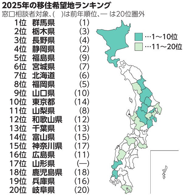 自治体と連携して移住を支援するふるさと回帰・移住交流推進機構は、2025年の移住希望地ランキングを発表しています。群馬県が前年に続いて1位となっています。上位には、東京へのアクセスが良い県が並んでいます。首都圏で働く現役世代が仕事との両立を考えやすく、自然や子育て環境が優れた移住先を求める傾向は続いています。