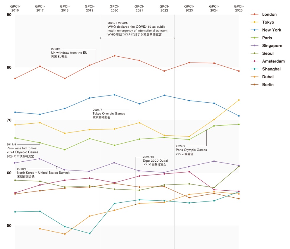 ロンドンは、14年連続で首位の座を堅持しています。4位のパリも3位のニューヨークとの差を縮めています。6位のソウルが5位のシンガポールの背後に迫り、上海はドバイとベルリンを上回り8位にランクインしています。