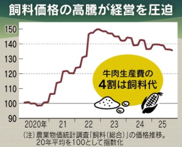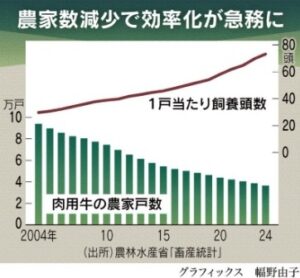 農林水産省によれば、全国の肉牛の農家戸数は2024年に3万6,500戸と10年で4割減少しました。一方、牛肉需要の増加で飼養頭数は4%増え、1戸当たり飼養頭数は2024年に73頭と、10年で6割増えています。厳しい労働環境を理由に新規就業者が減ったり、経営難の畜産農家が増えたりすれば、牛肉の安定供給に支障が出ることになります。