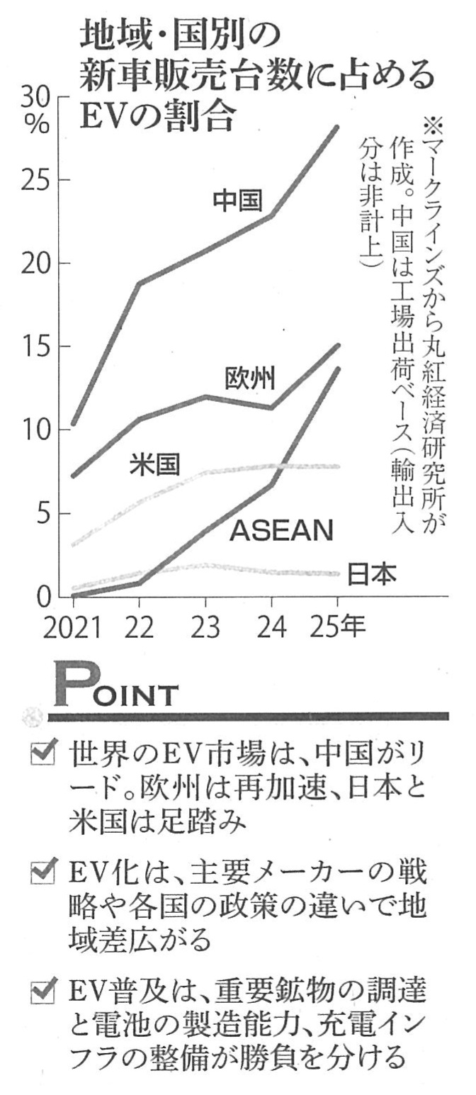 地域ごとに格差は広がっています。EVの成長をリードしているのは中国です。2025年のEV販売台数は約970万台で、新車販売に占める割合は28%です。中国製EVを多く輸入しているASEANも普及が進み、2021年にほぼ0%だったEV比率が、2025年は14%に上がっています。欧州では一時販売が停滞しましたが、EVの伸びが再加速し、2025年のEV比率は15%でした。フランスやドイツで伸びており、独フォルクスワーゲンなど欧州メーカーが販売を増やしているのが要因です。一方で、米国は足踏みが続き8%台です。日本は2023年をピークに減っており、わずか1%にとどまっています。