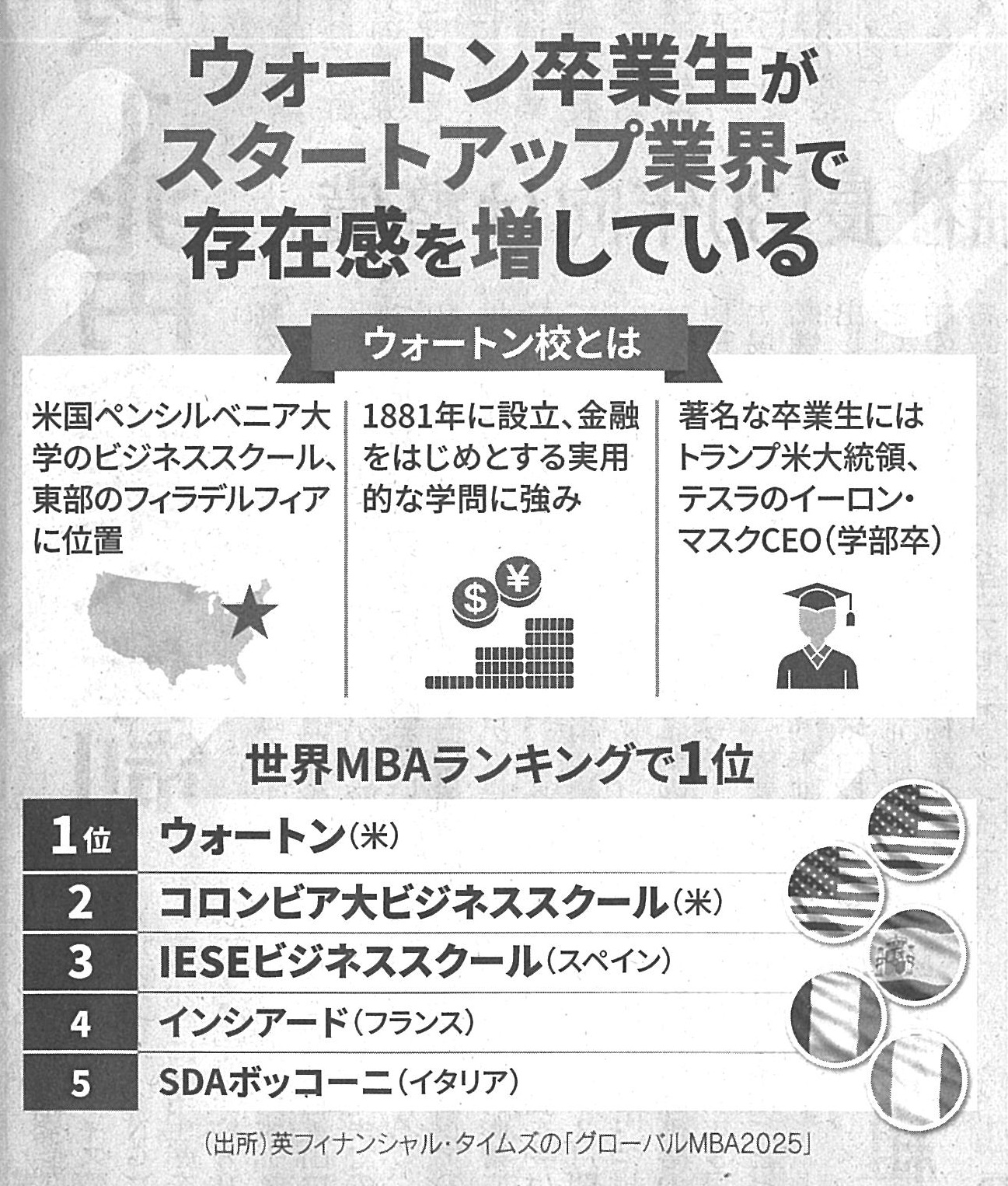 ウォートンは米国東部にあるペンシルベニア大学のビジネススクールで、トランプ米大統領の出身校でもあります。行動のための知識を掲げ、2025年の世界MBAランキングでは1位です。米ペンシルベニア大学ウォートン校の卒業生ネットワークがスタートアップ業界で目立っています。わが国の起業の相談や経営陣の構成、資金調達や社外取締役の紹介まで、同窓生が互いをサポートしあうコミュニティーとして機能しています。人脈はMBA留学で得られる財産の一つで、ウォートンの例はスタートアップ業界での流動性や支え合いに寄与しています。