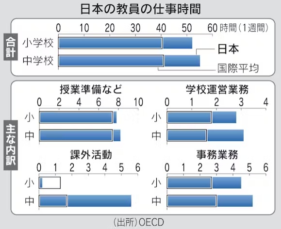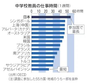OECDの国際教員指導環境調査によれば、日本の常勤教員の勤務時間が最長だったことが分かりました。小学校で週52.1時間、中学校で週55.1時間でした。小中学校とも2018年調査から4時間短くなっていますが、国際平均より10時間以上長くなっています。