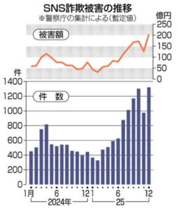 警察庁のまとめによれば、2025年のSNS詐欺被害件数は9,538件と前年から3千件余り増加しています。被害総額も約1,274億円と50%近く増えています。