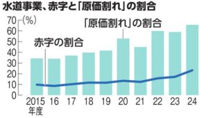 朝日新聞の調査によれば、全国の市町村などが経営する水道事業の2割が、2024年度の経常収支で赤字となっています。経常収支が赤字となった水道事業の割合は、2017年度に10.2%となって以降、10%台前半で推移していましたが、2023年度は17.1%に達しています。2024年度は全国1,632の水道事業のうち379事業が赤字で、23.2%となっています。過去10年間で初めての水準で、人口減と節水機器の普及といった長年の傾向に加え、人件費や資材費の高騰が追い打ちとなっています。