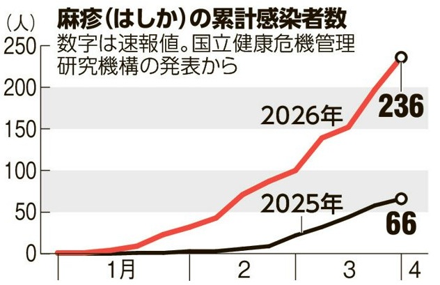 国立健康危機管理研究機構の発表によれば、麻疹の患者が増えています。今年に入り計236人が報告され、前年の同じ時期に比べ3.5倍になっています。新型コロナウイルス対策が緩和されてから、年々増加しており、2020年以降で最多ペースとなっています。
