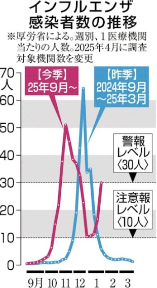 厚生労働省の発表によれば、全国約3千の定点医療機関から1月26日~2月1日の1週間に報告されたインフルエンザの感染者数は計11万4,291人で、1機関当たり30.03人でした。前週比1.80倍で、4週連続の増加です。1シーズン中に、警報レベルとされる1機関当たり30人をいったん下回った後、再び上回るのは、少なくとも過去10シーズンで初めてです。