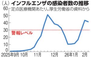 厚生労働省によれば、直近1週間(2月9~15日)のインフルエンザの患者数は、1医療機関あたり41.44人に達しています。1月26日~2月1日に30.03人となり、昨年12月15~21日以来、6週間ぶりに警報レベルの30人を超えています。