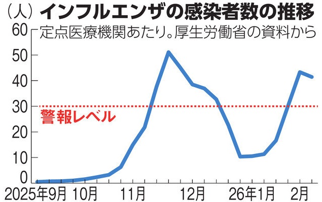 厚生労働省によれば、直近1週間(2月9~15日)のインフルエンザの患者数は、1医療機関あたり41.44人に達しています。1月26日~2月1日に30.03人となり、昨年12月15~21日以来、6週間ぶりに警報レベルの30人を超えています。