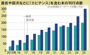 書名や目次などにエビデンスという単語を含む本の刊行点数が急増しています。先人の主観的な体験談よりも、客観的な根拠に基づいて判断を下そうとするデータ重視の姿勢がみてとれます。エビデンスは、元々ある治療法が科学的根拠に基づくことを説明する医学用語として使われることが多く、かつてはエビデンス本の大半が医療従事者向けの専門書でした。しかし、自己啓発書など専門書以外のエビデンス本がじわじわ増えています。