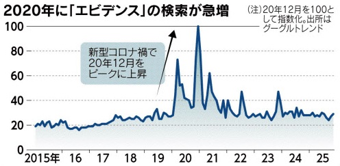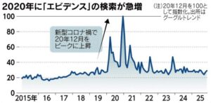エビデンスという言葉が力を持ったきっかけは新型コロナ禍です。感染対策やワクチン接種を巡って情報が錯綜し、エビデンスという単語が連日メディアやSNSをにぎわしました。エビデンスという単語の検索量を数値化すると、2020年が突出して多くなっています。