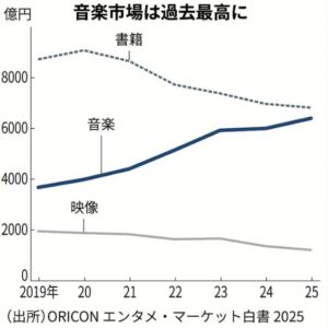 音楽や映像の市場動向をまとめたORICONエンタメ・マーケット白書の2025年版によれば、音楽市場の推定総売り上げは前年比7%増の6,410億円で過去最高でした。音楽市場の成長をけん引したのはストリーミングです。音楽市場のうちデジタル市場の総売上金額は7%増の3,903億円で、CDや音楽DVDなどのソフト市場は6%増の2,507億円でした。売上枚数は1%増の7,212万枚でした。