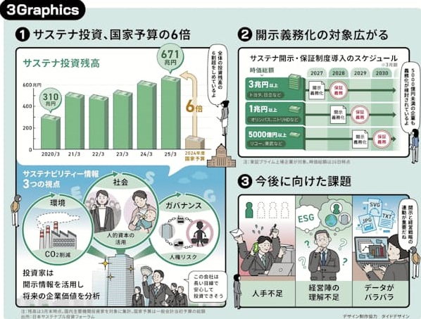 サステナビリティー情報は、企業が今後のリスクや事業機会をどう捉えているかを反映しています。投資家にとっては、持続的に価値を生む力を見積もる物差しとなります。例えば、温暖化ガスの排出量は将来の税負担や規制リスクを見通す手がかりになります。日本サステイナブル投資フォーラムによれば、国内の機関投資家約60社のサステナ投資残高は、2025年3月末時点で671兆7,644億円に達し、2024年度の国家予算(約113兆円)の6倍の規模となっています。