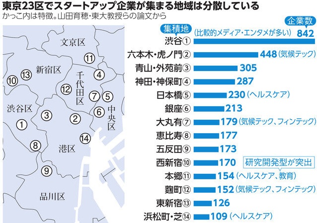 1万社規模のスタートアップ企業が集まる東京は、特定分野や地域への一極集中ではなく分散型のエコシステムを育んできました。世界を見ればIT・ソフトウェアが中心の米シリコンバレー、バイオ・医療に強いボストンなど、スタートアップ集積地には特色があります。しかし、スタートアップは23区全体に広がっているわけではなく、限られたエリアに集中しています。最大の集積地は渋谷で、メディア・エンタメ系を中心に数が多く、裾野が広くなっています。