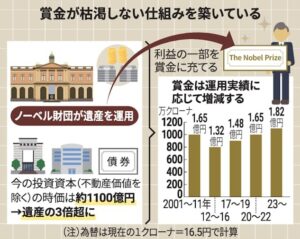 賞の原資は、ノーベルが持っていた350の特許から築いた巨万の富です。遺産の総額は3,100万クローナで、現在の価値で約360億円にのぼります。遺産から賞金を出し続ければ、いつかは枯渇しています。ノーベル財団は、株式や債券、不動産などの形で資産を運用しています。
