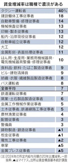 専門スキルを持つ現業職であるブルーワーカーで賃上げの勢いに格差が出てきています。厚生労働省の賃金構造基本統計調査によれば、所定内給与の伸び率が顕著なのがタクシー運転者で40%増えています。とび職・鉄筋工・型枠工など建設躯体工事従業者は18%増え、事務職を含む全体平均の7%増の伸びを上回っています。