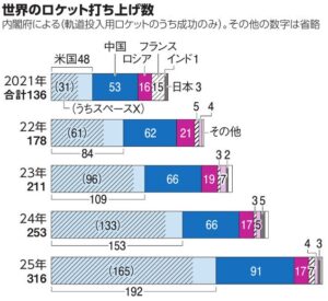 米NGOの報告書によれば、世界の宇宙経済は、2024年に過去最高の6,130億ドル(約94兆円)に達しています。早ければ、2032年に1兆ドル(約150兆円)を超える可能性があります。それを裏付けるように、ロケットの打ち上げ回数が加速しています。内閣府によれば、衛星の軌道投入に成功したのは、2021年の136回から2025年の316回にまで増えています。一方、日本国内での打ち上げ回数は、2025年に3回、2024年に5回、2023年に2回、2022年に0回にとどまっています。
