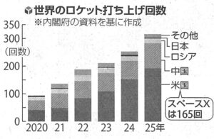 世界のロケット打ち上げは、近年急増しています。内閣府のまとめによれば、2025年に人工衛星などの軌道投入に成功したのは2020年の約3倍となる316回でした。米国がこのうち6割超の192回を占めています。米国は官民のすみ分けが鮮明で、NASAがアルテミス2などの難易度の高いプロジェクトを主導し、民間が衛星などの打ち上げに力を発揮しています。民間の大部分はスペースXです。