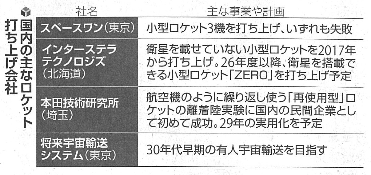 スペースワンは、国内の民間ロケット打ち上げの先頭集団に位置付けられています。新興中小企業の技術開発を支援する政府の制度で、今後2年間にスペースワンに最大44.6億円、インターステラテクノロジズには最大73.7億円が交付されることになっています。政府は、国内の2030年代の宇宙産業市場を2020年の2倍の8兆円にする目標を掲げており、期待感を背景にスペースワンの出資者は当初の4倍の16社に増加し、200億円を超える資金を調達しています。